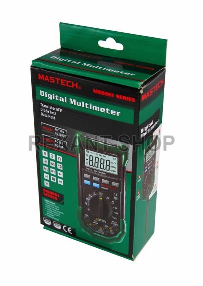 Мульти́метр MS8269 MASTECH—электроизмерительный прибор который включает в себя несколько функций и набор измеряемых параметров. Все приборы серии MS8269 измеряют постоянное и переменное напряжение, а так же постоянный и переменный ток, сопротивление в цепи, емкость, индуктивность и даже температуру. А так же с помощью данного прибора можно проводить тестирование диодов и осуществлять прозвонку целостности цепи. Таким образом, один прибор сможем заменить сразу несколько устройств одновременно. Прибор MS8269 является портативным мультиметром, компактные размеры позволяют всегда носить его с собой. Но, несмотря на размеры, данный мультиметр обладает широким функционалом и это выгодно отличает его от других. Прибор имеет функцию удержания результата измерений Data hold, для тех случаев, когда измерения проводятся в труднодоступных местах и не всегда есть возможность взглянуть на экран. Дисплей прибора оснащен подсветкой, которая позволяет проводить измерения даже в слабоосвещенных местах. Инженеры старались сделать прибор максимально удобным для использования. Выбор измеряемых величин и пределов измерений производиться с помощью усиленного поворотного регулятора, благодаря которому исключается возможность случайного нажатия. Прибор изготовлен из высококачественных материалов, калибровка и тестирование приборов произведено под контролем компании REXANT INTERNATIONAL.