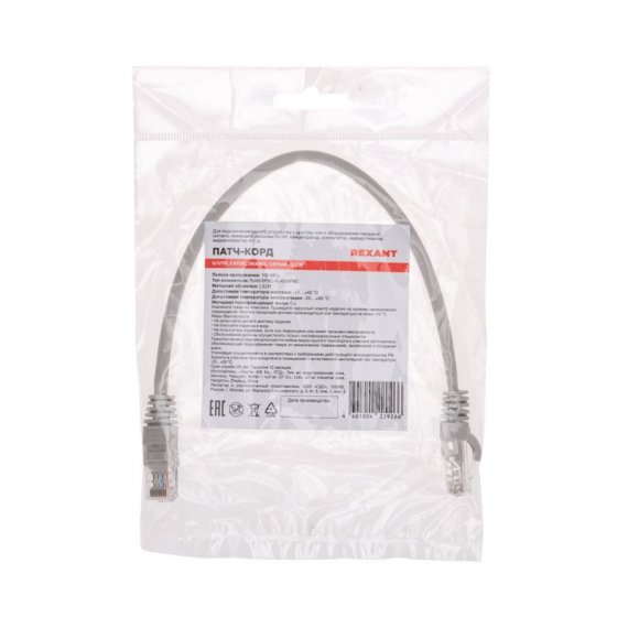 Патч-корд U/UTP, CAT 5e, RJ45-RJ45, 26AWG, LSZH, серый, 0,3м REXANT