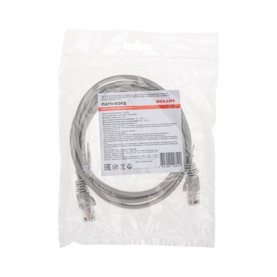 Патч-корд U/UTP, CAT 5e, RJ45-RJ45, 26AWG, LSZH, серый, 2м REXANT