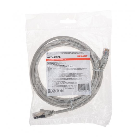 Патч-корд F/UTP, CAT 5e, RJ45-RJ45, 26AWG, LSZH, серый, 2м REXANT