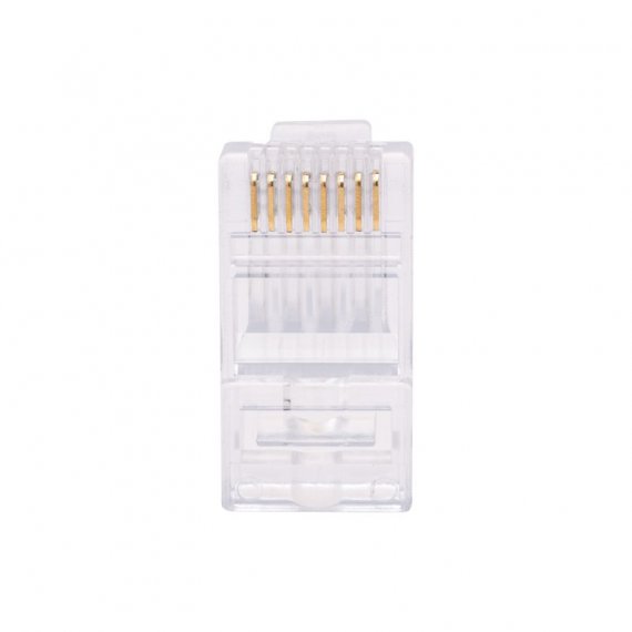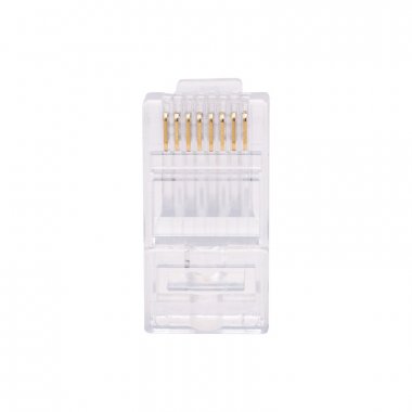 Штекер изготовлен из прозрачного качественного пластика. Имеет 8 посадочных мест и 8 ножей-контактов, которые покрыты слоем технического золота 3 мкм для повышения пропускной способности разъема.