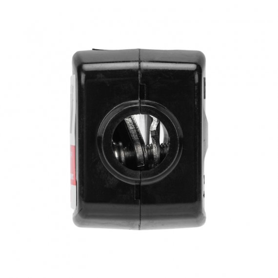 Это компактное приспособление представляет собой пластиковый короб с двумя входами. Внутри расположен зажим кулачкового типа, затягиваемый болтами. При монтаже достаточно снять изоляцию с магистрального провода и ответвительной жилы без их разрезания, благодаря чему увеличивается надежность электрического контакта.