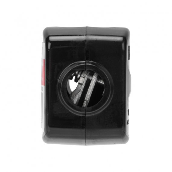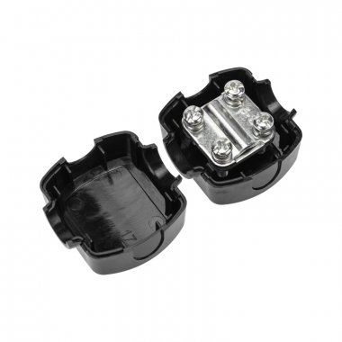 Это компактное приспособление представляет собой пластиковый короб с двумя входами. Внутри расположен зажим кулачкового типа, затягиваемый болтами. При монтаже достаточно снять изоляцию с магистрального провода и ответвительной жилы без их разрезания, благодаря чему увеличивается надежность электрического контакта.
