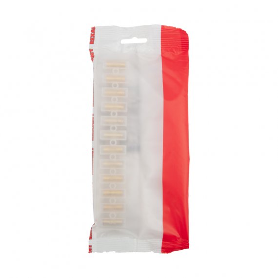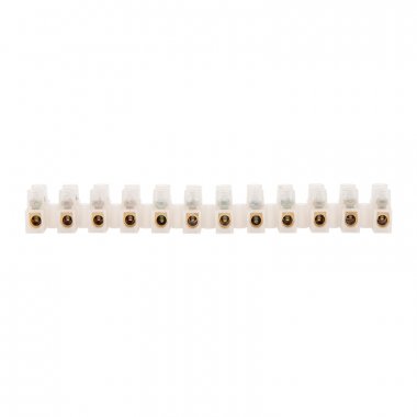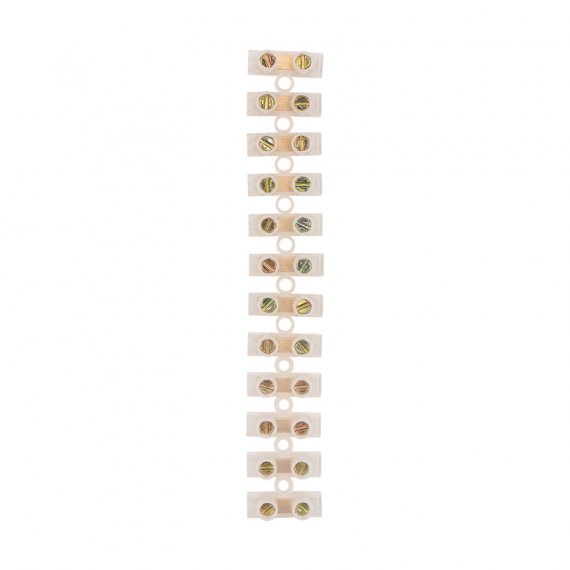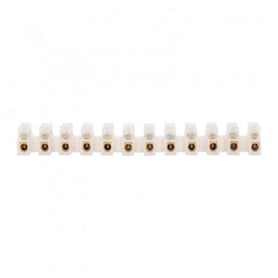 Соединение осуществляется с помощью медных контактов. Кабели и провода фиксируются винтовым зажимом. Клеммная колодка изготовлена из полупрозрачного полиэтилена.