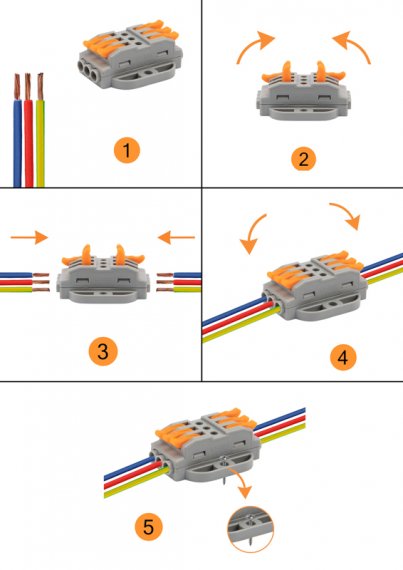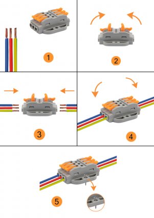 Многоразовые трехпроводные клеммы REXANT с монтажной площадкой предназначены для соединения медных одножильных и многожильных зачищенных проводников тонкого сечения. Контакт осуществляется путем зажима проводника пластиной. Конструкция предотвращает случайное размыкание контакта. Специальное технологическое отверстие на корпусе клеммы предназначено для проверки соединения тестером-пробником или щупом мультиметра. Корпус из пластика делает контакт изолированным.
