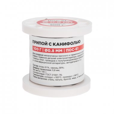 Припой с канифолью ПОС-61, 100г, ?0,8мм, (олово 61%, свинец 39%), катушка REXANT