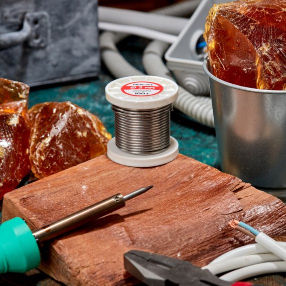 Припой с канифолью ПОС-61 используется для создания прочного и герметичного соединения деталей и их фиксации на плате.