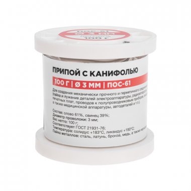 Припой с канифолью ПОС-61, 100г, ?3мм, (олово 61%, свинец 39%), катушка REXANT