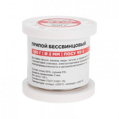 Припой ПОСу 95-5, 100г, ?2мм, (олово 95%, сурьма 5%), бессвинцовый, ГОСТ 21931-76, катушка REXANT