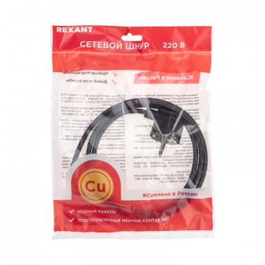 Шнур электрический с вилкой ПВС 3х0,75 мм? 5м черный REXANT Электрический шнур предназначен для подключения бытовых приборов и осветительной техники к сети. Используется при ремонте или замене штатного шнура питания. Жилы изготовлены из меди, что обеспечивает высокую токопроводимость. Заземление обеспечивает защиту от электрического замыкания и повышает безопасность использования. Литая неразборная вилка евростандарта гарантирует стабильное подключение и надежную фиксацию в розетке. Угловая форма вилки облегчает подключение в ограниченном пространстве и уменьшает износ кабеля. Шнур имеет зачищенные контакты, что экономит время и упрощает процесс подключения.