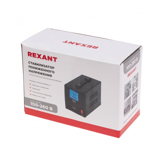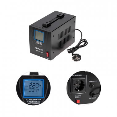 Однофазный стабилизатор переменного напряжения релейного типа марки REXANT используется для предотвращения поломки бытовых и промышленных электроприборов вследствие перепадов напряжения в сети.
