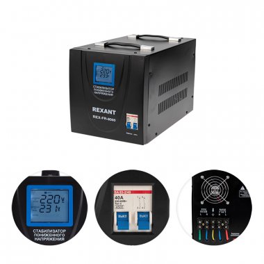 Однофазный стабилизатор переменного напряжения релейного типа марки REXANT используется для предотвращения поломки бытовых и промышленных электроприборов вследствие перепадов напряжения в сети.