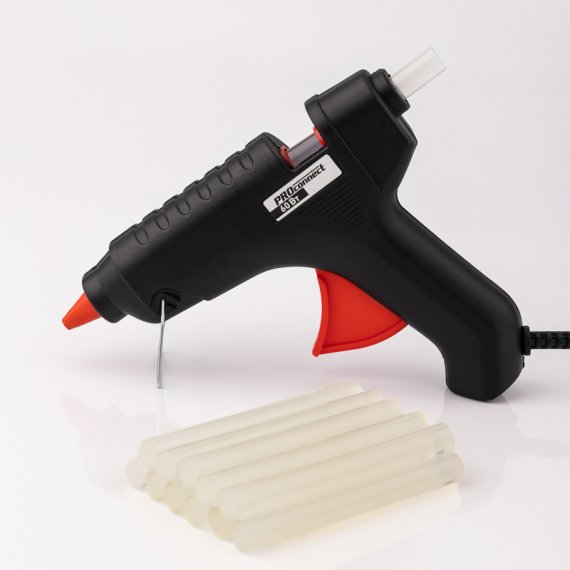 Высокомощный клеевой пистолет мощностью 60 Вт используется для прочной фиксации поверхностей с помощью расплавленной клеевой массы, применяется как в профессиональной области, так и в быту для создания элементов декора. Совместим практически с любыми материалами: деревом, пластиком, резиной, кожей, стеклом, металлами (их лучше перед работой разогревать феном), тканью, пенопластом, керамикой, картоном, бумагой, цветами и т.п. При включении прибора в электросеть 220 В патроны начинают разогреваться до температуры 175℃-185℃ и плавиться. Точное дозирование достигается за счет нажатий на курок. Склеенными предметами можно пользоваться в среднем уже через 10 минут. Ударопрочный корпус оснащен скобой для фиксации инструмента на горизонтальных поверхностях. Высокая производительность 9-11 г/мин позволяет отнести пистолет к экономичному инструменту, который справляется с широким спектром задач.