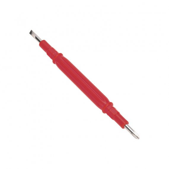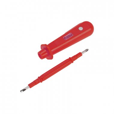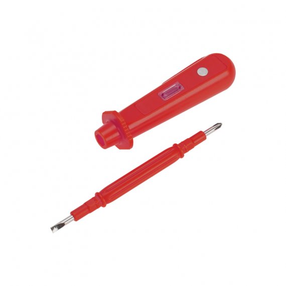 Тестер оснащен переставным жалом, которое может быть использовано в двух вариантах: крестообразное или шлицевое. Это позволяет оператору выбрать подходящий тип жала в зависимости от требований конкретной ситуации. Сталь высокой закалки (50HRC) позволяет использовать тестер как отвертку. Наличие намагниченных наконечников обеспечивает удобство при удержании винтов, что особенно полезно при работе с клеммными колодками и светильниками.