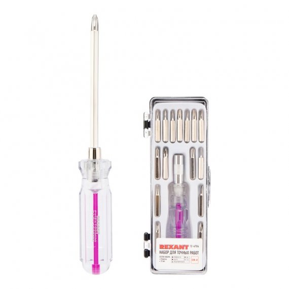 Набор отверток для точных работ + отвертка комбинированная REXANT Набор отверток предназначен для выполнения высокоточных работ в электронике и электромеханике. Комбинированная отвертка поможет вам в монтаже/демонтаже крепежных соединений. Эргономичная двухкомпонентная рукоятка отвертки делает работу с инструментом легкой и удобной. Магнитный держатель обеспечивает быструю замену и надежную фиксацию насадок. Биты набора выполнены из хромованадиевой стали. В набор входит: Отвертка для точных работ – 1 шт. Биты – 15 шт. (PH00, PH0, PH1, PH2, T5, T6, T7, T8, T9, T10, T15, U4, ?, SL2, SL3) Отвертка комбинированная – 1 шт. (Длина: двухсторонний стержень 120 мм; Шлиц: PH 2, SL 6; Прозрачная рукоятка).