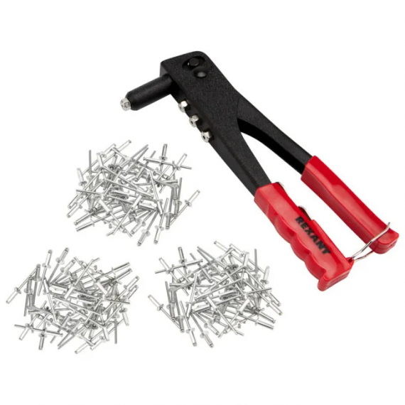 Набор для установки заклепок REXANT Набор для установки заклепок применяется для скрепления деталей в труднодоступных местах. Комплектация: заклепочник 2,4-4,8мм длиной 240мм, заклепки 4,0x12мм (50 шт). Заклепочник изготовлен из конструкционной стали, которая обеспечивает прочность инструмента. Оснащен резиновыми накладками на рукоятках, что создает удобство в процессе работы. Использован механизм, позволяющий снизить усилие на рукоятях. Специальная скоба на конце рукояток упрощает хранение заклепочника. Вытяжные заклепки представляют собой крепежные изделия для механического соединения двух и более деталей. Подходят для скрепления металла, древесины, пластмассы, кожи. Удобны тем, что для их установки необходим доступ к скрепляемым поверхностям лишь с одной стороны.