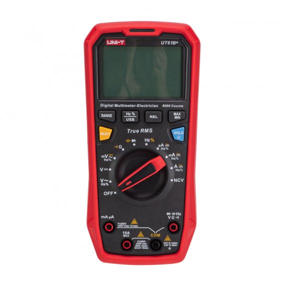 Профессиональный TRUE RMS мультиметр последнего поколения UNI-T UT61B+ с ударопрочным корпусом применяется с целью измерения постоянного/переменного напряжения, силы тока, сопротивления, емкости и частоты с большим разрешением и точностью. Призван заменить сразу снятые с производства модели 61A и 61B. Присутствует аналоговая шкала. Дисплей на 6 000 разрядов с подсветкой облегчает считывание результатов при слабом внешнем освещении. Функция удержания данных обеспечивает удобство при работе в местах с ограниченным доступом. Выбор диапазона измерения производится автоматически или вручную.