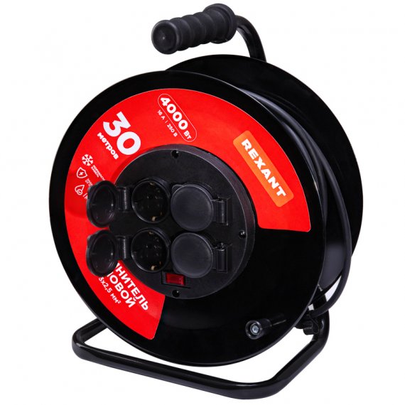 Удлинитель силовой КГ на катушке 4 гнезда, с/з, 30м, 3х2,5мм?, IP44 с выключателем, c защитными крышками, металлическая катушка REXANT Силовой удлинитель REXANT предназначен для подключения электрических приборов и электроинструментов. Незаменим в случае, когда стандартной длины шнура недостаточно для питания от стационарных розеток. Устройство оснащено четырьмя гнездами, что позволяет подключить несколько устройств. Автоматическая защита от перегрузки и заземление повышают безопасность использования. Удлинитель длиной 30 м позволяет удобно разместить приборы на нужном расстоянии от розетки, а высококачественные материалы и конструкция обеспечивают надежность работы. ВНИМАНИЕ! Перед включением максимальной нагрузки необходимо полностью размотать шнур.