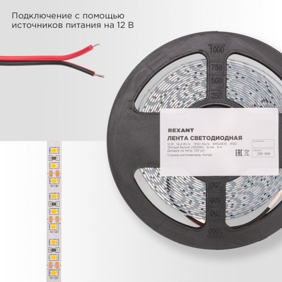 Rexant 141-220 Лента светодиодная 12В, SMD2835, 14,4Вт/м, 120 LED/м, 3000K