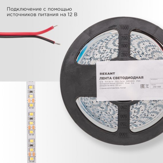 Rexant 141-222 Лента светодиодная 12В, SMD2835, 14,4Вт/м, 120 LED/м, 6500K