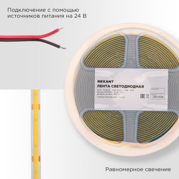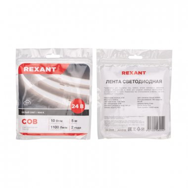 Rexant 147-101 Лента светодиодная 24В, COB 10Вт/м, 384 LED/м, 4000K, 8мм