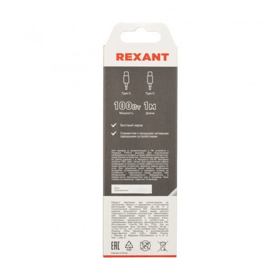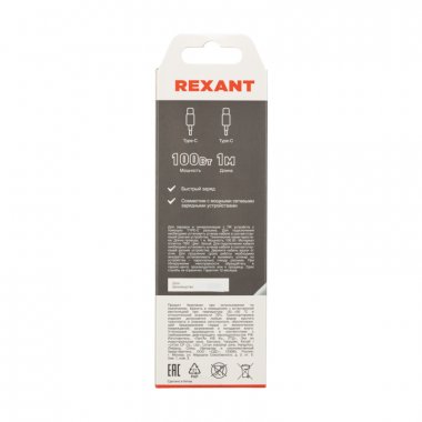 Rexant 18-1832 Кабель Type-C - Type-C, 3А, 100Вт, 1м, ПВХ