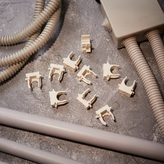Изделие оснащено фиксаторами типа "шип-паз": при установке возможно соединять крепежи-клипсы различных диаметров.