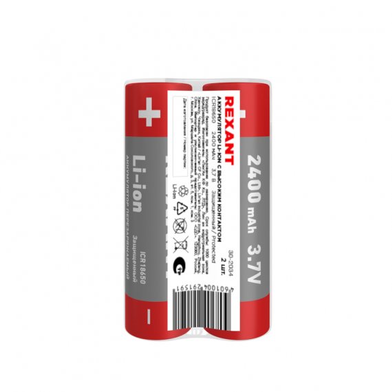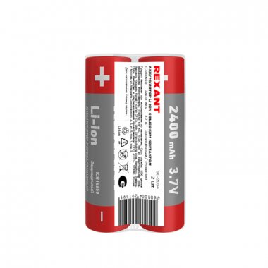 Аккумулятор Li-ion (литий-ион) 18650, 3,7В, 2400мАч, с платой защиты, 2 шт, пластиковая упаковка REXANT Литий-ионный аккумулятор предназначен для использования в фонарях и других устройствах с высоким энергопотреблением. Выполняет свои функции заметно быстрее, чем гелевые аналоги. Отличается быстрой зарядкой и имеет высокое количество максимальных зарядов. Отсутствует «эффект памяти», то есть нет необходимости полностью разряжать, а потом заряжать аккумулятор перед работой. Литиевый аккумулятор абсолютно безопасен для окружающей среды, так как не выделяет вредных веществ. Большим преимуществом является небольшая масса изделия. Типоразмер – 18650. Емкость – 2400 мАч. Напряжение – 3,7 В. Электрохимическая система – литий-ионные. Предусмотрена защита от чрезмерного заряда/разряда.