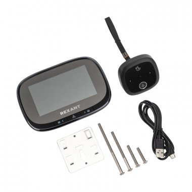 - Комплект поставки: видеоглазок, дисплей, металлический кронштейн, инструкция, крепежные винты, USB-кабель