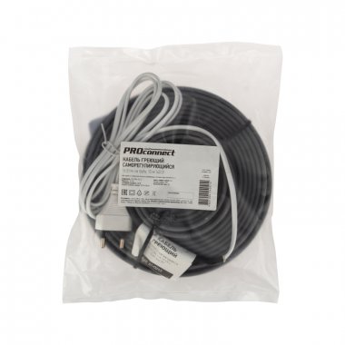Комплект саморегулирующегося кабеля PROconnect мощностью 16 Вт/м используется для профилактики промерзания и образования наледи в бытовых трубопроводах, на счетчиках воды, вентилях и так далее. Подходит для использования как в помещениях, так и на улице. Нагревательный кабель соединен с питающим кабелем, на конце которого находится евровилка для подключения в розетку. В нормальных условиях его температура не превышает 65 °C.