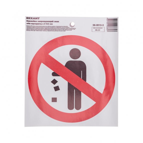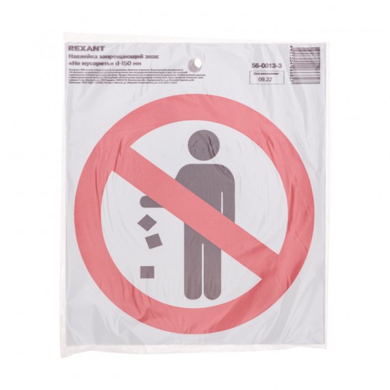 Rexant 56-0013-3 Наклейка запрещающий знак «Не мусорить» с хедером; d-150 мм