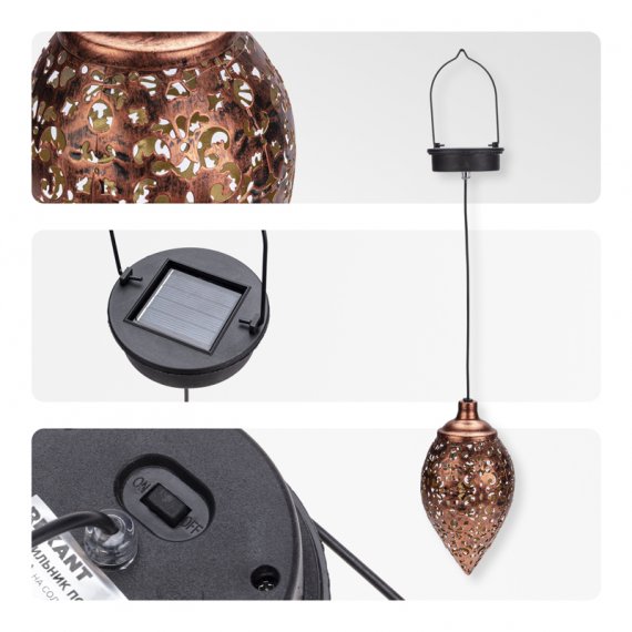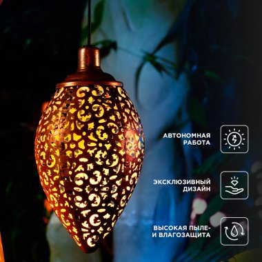 Светильник подвесной Фатих, 3000К, встроенный аккумулятор, солнечная панель, коллекция Стамбул REXANT Подвесной светильник Фатих – это изысканный элемент садового декора, предназначенный для создания дополнительного освещения или акцентной подсветки. Может быть размещен в беседках, на верандах, деревьях, арках, а также на садовых скульптурах или инсталляциях. Дизайн светильника вдохновлен богатой историей и культурой Стамбула, что привнесет в ваш сад нотки восточной элегантности и утонченности. Оттенки и фактуры материалов в сочетании с тщательно продуманными деталями придают изделию изящный вид, создавая атмосферу загадочности. Светильник оснащен солнечной панелью, которая поглощает солнечные лучи в течение дня и преобразует их в электрическую энергию. Накопленная энергия хранится во встроенном аккумуляторе, что позволяет светильнику автономно функционировать около 6-8 часов и освещать окружающую территорию вечером и ночью, не требуя подключения к электросети.