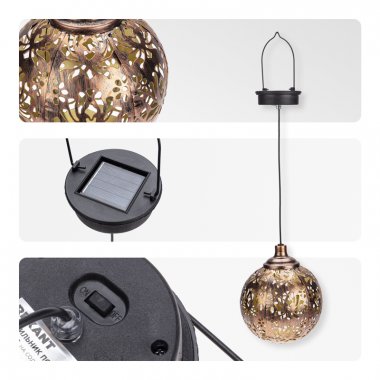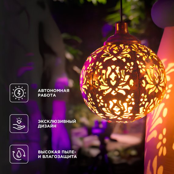 Светильник подвесной Галата, 3000К, встроенный аккумулятор, солнечная панель, коллекция Стамбул REXANT Подвесной светильник Галата – это изысканный элемент садового декора, предназначенный для создания дополнительного освещения или акцентной подсветки. Может быть размещен в беседках, на верандах, деревьях, арках, а также на садовых скульптурах или инсталляциях. Дизайн светильника вдохновлен богатой историей и культурой Стамбула, что привнесет в ваш сад нотки восточной элегантности и утонченности. Оттенки и фактуры материалов в сочетании с тщательно продуманными деталями придают изделию изящный вид, создавая атмосферу загадочности. Светильник оснащен солнечной панелью, которая поглощает солнечные лучи в течение дня и преобразует их в электрическую энергию. Накопленная энергия хранится во встроенном аккумуляторе, что позволяет светильнику автономно функционировать около 6-8 часов и освещать окружающую территорию вечером и ночью, не требуя подключения к электросети.