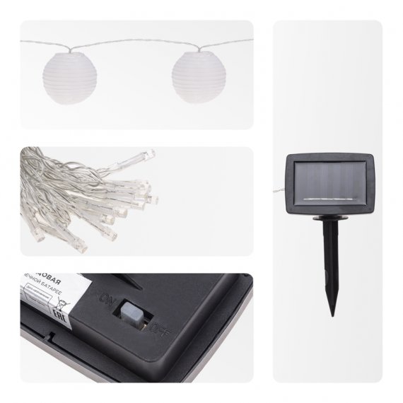 Гирлянда оснащена солнечной панелью, которая поглощает солнечные лучи в течение дня и преобразует их в электрическую энергию.