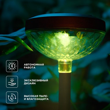 Светильник грунтовый Таянг, 3000К/RGB, встроенный аккумулятор, солнечная панель, коллекция Пекин REXANT Грунтовый светильник Таянг – это изысканный элемент садового декора, предназначенный для подсветки пешеходных дорожек, тропинок, цветников, а также различных архитектурных деталей ландшафта. Дизайн изделия сочетает в себе современные элементы и восточные мотивы, воплощая дух Пекина – древнего и красивого города с богатой историей. Включенный светильник создает необычные узоры на поверхностях, добавляя загадочности и чарующей прелести ночному саду. Светильник оснащен солнечной панелью, которая поглощает солнечные лучи в течение дня и преобразует их в электрическую энергию. Накопленная энергия хранится во встроенном аккумуляторе, что позволяет светильнику автономно функционировать около 6-8 часов и освещать окружающую территорию вечером и ночью, не требуя подключения к электросети.