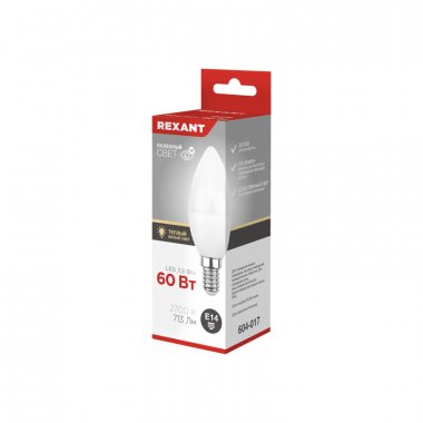 Лампа светодиодная Свеча (CN) 7.5 Вт E14 713 Лм 2700 K 3 шт. в упаковке Светодиодная матовая лампа REXANT A60 в форме свечи мощностью 7.5Вт с цоколем E14 и с теплым белым свечением в 2700K прекрасно подходит для освещения комнат любого типа, домов, гостиниц, кафе, и других объектов. Светодиодные лампочки обладают высокой энергоэффективностью, износоустойчивостью и долгим сроком службы (в 20-25 раз дольше, чем лампы накаливания). За счет распространения света во всех направлениях, светодиодные лампочки REXANT потребляют еще меньше электроэнергии при более высокой яркости по сравнению с лампами накаливания. Они отличаются низким нагреванием корпуса и независимостью яркости освещения от перепадов напряжения.