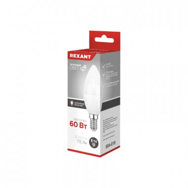 Лампа светодиодная REXANT CN Свеча 7.5 Вт 713 Лм 4000 K E14 матовая колба 3 шт. в упаковке Светодиодная матовая лампа REXANT A60 в форме свечи мощностью 7.5 Вт с цоколем E14 и с нейтральным белым свечением в 4000 K прекрасно подходит для освещения комнат любого типа, домов, гостиниц, кафе, и других объектов. Светодиодные лампочки обладают высокой энергоэффективностью, износоустойчивостью и долгим сроком службы (в 20-25 раз дольше, чем лампы накаливания). За счет распространения света во всех направлениях, светодиодные лампочки REXANT потребляют еще меньше электроэнергии при более высокой яркости по сравнению с лампами накаливания. Они отличаются низким нагреванием корпуса и независимостью яркости освещения от перепадов напряжения.