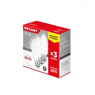 Лампа светодиодная Свеча CN 7,5Вт E27 713Лм 4000K нейтральный свет (3 шт/уп) REXANT