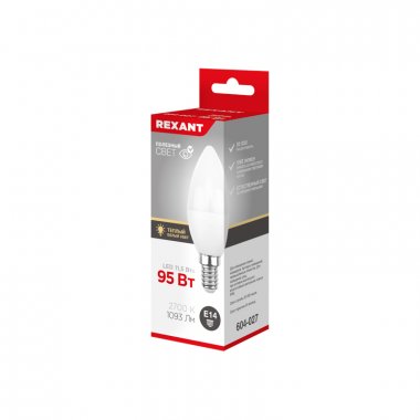 Лампа светодиодная REXANT CN Свеча 11.5 Вт 1093 Лм 2700 K E14 матовая колба 3 шт. в упаковке Светодиодная матовая лампа REXANT A60 в форме свечи мощностью 11.5 Вт с цоколем E14 и с теплым белым свечением в 2700 K прекрасно подходит для освещения комнат любого типа, домов, гостиниц, кафе, и других объектов. Светодиодные лампочки обладают высокой энергоэффективностью, износоустойчивостью и долгим сроком службы (в 20-25 раз дольше, чем лампы накаливания). За счет распространения света во всех направлениях, светодиодные лампочки REXANT потребляют еще меньше электроэнергии при более высокой яркости по сравнению с лампами накаливания. Они отличаются низким нагреванием корпуса и независимостью яркости освещения от перепадов напряжения.
