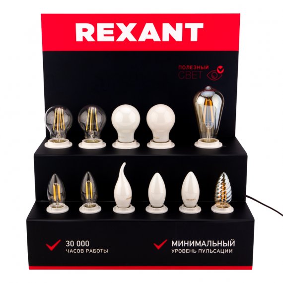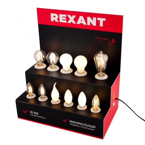 Демо-тестер REXANT предназначен для демонстрации и проверки работоспособности филаментных ламп марки REXANT в точках продаж.