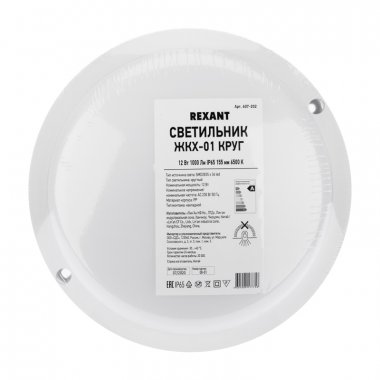 Светильник REXANT серии ЖКХ оснащен долговечным светодиодным источником света номинальной мощностью 12 Вт и световым потоком 1000 Лм.