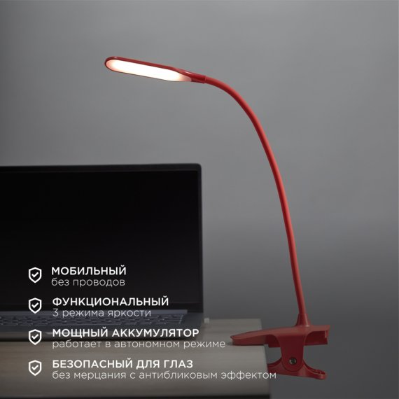 Светильник настольный Click 4Вт, LED, 4000К, диммируемый 3 ступени, заряжаемый, на прищепке, красный REXANT