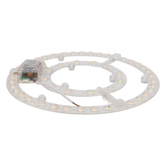 Модуль светодиодный с драйвером REXANT 48 Вт 2700-6500 К LED диммируемый с пультом дистанционного управления Светодиодный модуль с линзами и драйвером REXANT используется в качестве источника света для настенно-потолочных светильников. Возможна установка в светильники как с пластиковыми, так и со стеклянными плафонами. Удобное регулирование режимов цветовой температуры от теплого(2700К) до холодного (6500К) света. Магнитные опоры позволяют закрепить светодиодный модуль с драйвером без применения винтов, избежав сложного монтажа. Клеммная колодка позволяет в считанные минуты осуществить монтаж модуля в светильник. Технические характеристики: Тип источника света: LED Световой поток: 3900 Лм Мощность светильника: 48 Вт Диммируемый: да Угол рассеивания: 250 градусов Коррелированная цветовая температура (в сфере): 2700-6500 К (АС) 230 В/50 Гц Диапазон напряжения питания: 220-240 В tc=75 °C Класс защиты от поражения током: II Температурный режим: +5...+40 °C Класс защиты: IP20 Коэффициент пульсации: <5% Габаритные размеры: 265х25 мм Класс энергоэффективности: A Коэффициент мощности: >0.9 Питание пульта дистанционного управления: батарейки типа ААА, 2 шт. (в комплект не входят) Материал рассеивателя: светопропускающий пластик Цвет корпуса: белый