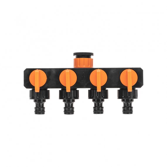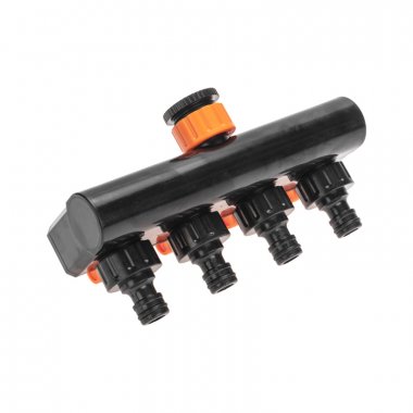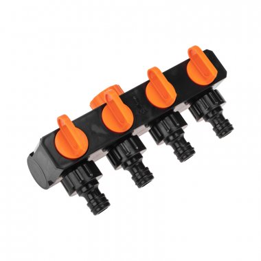Разветвитель представляет собой изделие, предназначенное для подключения четырех шлангов через коннекторы к крану с внешней резьбой. Применяется при организации систем полива и систем водоснабжения.