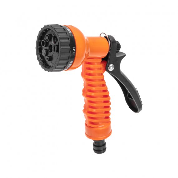 Пистолет-распылитель оснащен эргономичной ручкой, благодаря которой изделие удобно и комфортно держать в руке. Имеет 7 режимов подачи воды, регулируемых поворотной головкой. Также на пистолете предусмотрен фиксатор, позволяющий зафиксировать курок и не зажимать его пальцами в процессе полива.
