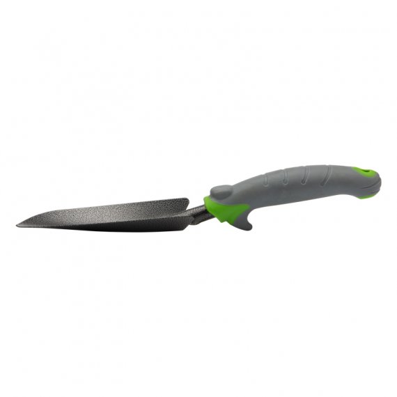 Рабочая часть выполнена из прочной нержавеющей углеродистой стали. Обеспечивает долгий срок службы совка даже при работе с каменистой почвой. Двухкомпонентная рукоятка с удобным упором сделана из прочного пластика.