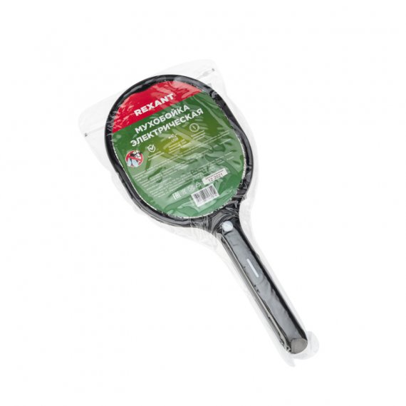 Электрическая мухобойка REXANT размером 21х7х49 см выполнена в виде ракетки для бадминтона. При нажатии кнопки, расположенной на рукоятке, во внутренней сетке возникает малый разряд тока (1000 В). В результате насекомое при контакте с сеткой получает смертельный удар. Такой способ уничтожения комаров не оставляет следов на стенах и потолке. Наружные сетки являются защитными и на них ток не поступает.