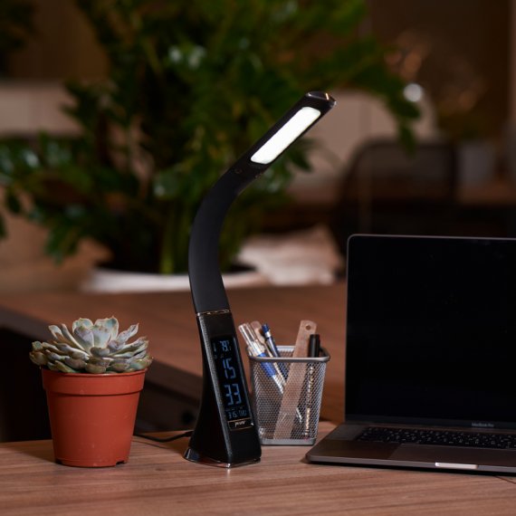 Светильник настольный REXANT Cesar LED с поворотом излучающей поверхности на 360°, 5000 К, часы, термометр, будильник, календарь, цвет черный