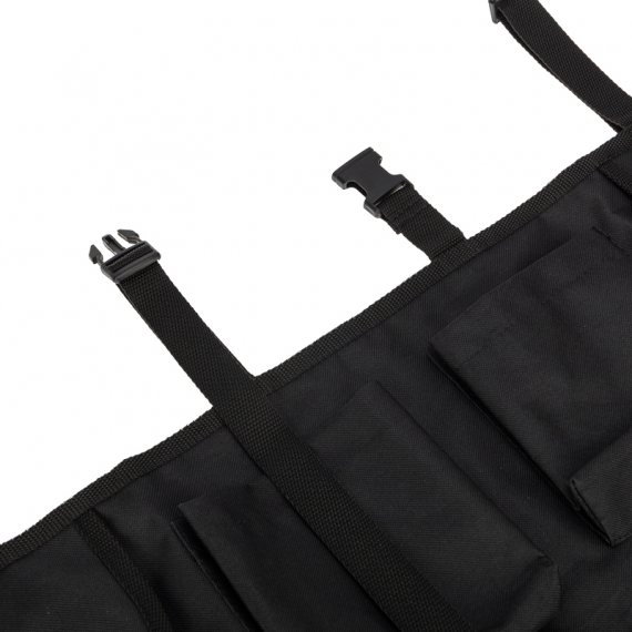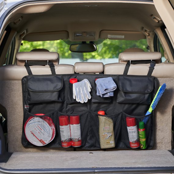 Органайзер на спинку заднего сиденья (большой) – это функциональный аксессуар, разработанный для организации и хранения различных предметов в багажнике автомобиля. Изделие представляет собой прочный и просторный органайзер, который крепится за подголовники спинки заднего сиденья (закрывает всю площадь спинки).