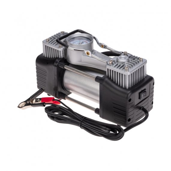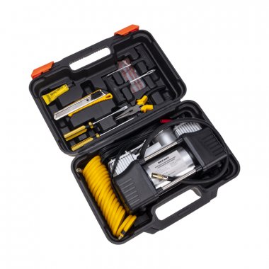 Компрессор автомобильный, металлический усиленный, двухпоршневой, 60 л/мин, с питанием от АКБ автомобиля, в кейсе с набором инструментов REXANT. Используется для накачки автомобильных шин легковых автомобилей, кроссоверов, внедорожников и малого коммерческого транспорта.